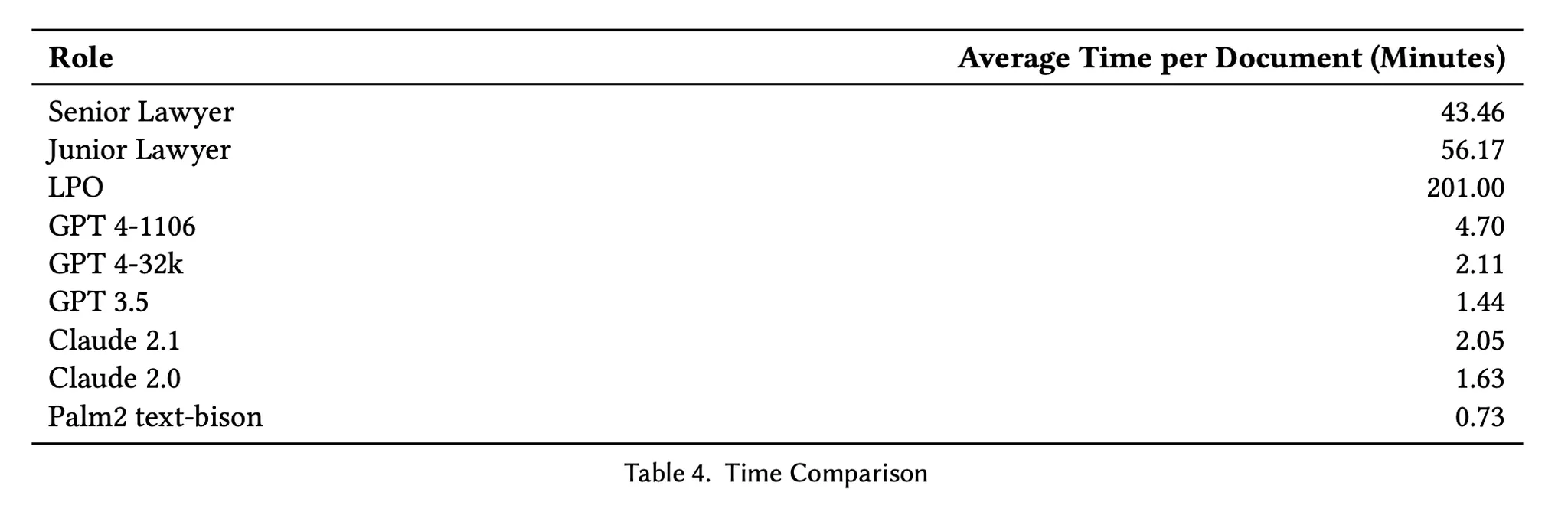 그 결과 시니어 변호사와 주니어 변호사는 문서당 각각 평균 43.46분, 56.17분이 소요되었습니다. 반면 모든 LLM은 현저히 더 높은 시간 효율성을 보였는데요. PaLM2 Text Bison은 평균적으로 0.73분 만에 하나의 문서를 처리할 수 있었고, 가장 오랜 시간이 소요된 GPT4-1106도 변호사에 비해 현저히 짧은 시간인 평균 4.70분이 소요되었습니다.