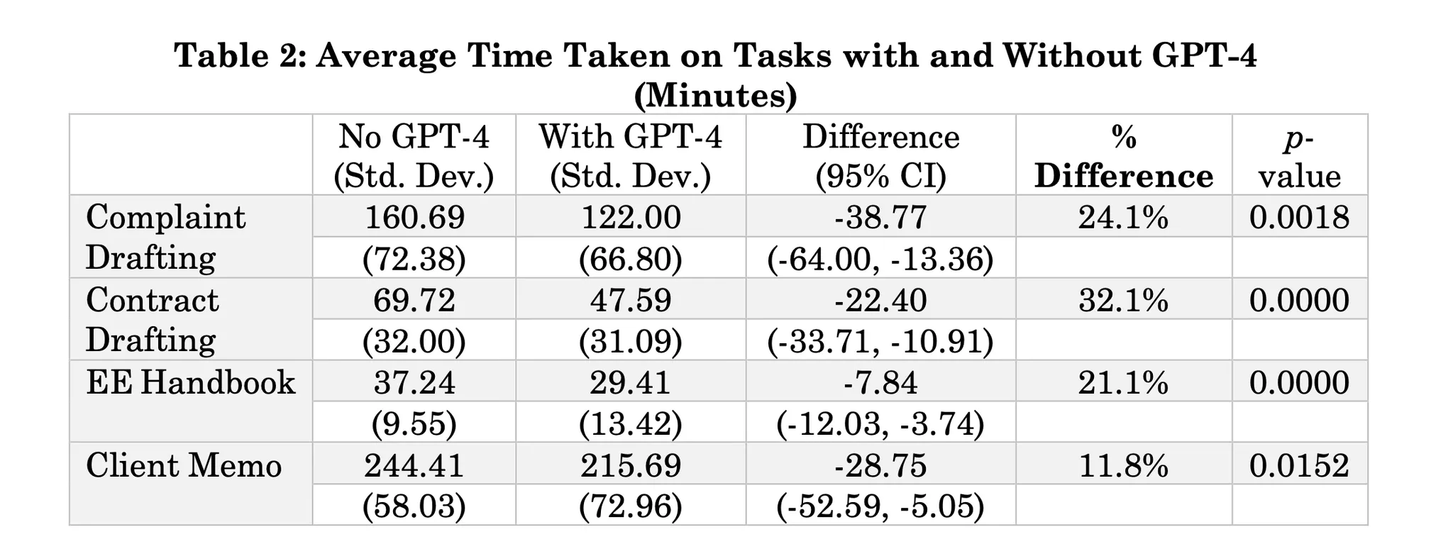 놀랍게도 과제 수행 결과 GPT-4를 활용한 그룹이 모든 항목에서 작업 시간을 단축한 것으로 나타났어요. 구체적으로는 고소장 작성 24%, 계약서 작성 32%, 취업 규칙 작성 21%, 고객 메모 작성 12%의 시간 절감 효과를 보였습니다.