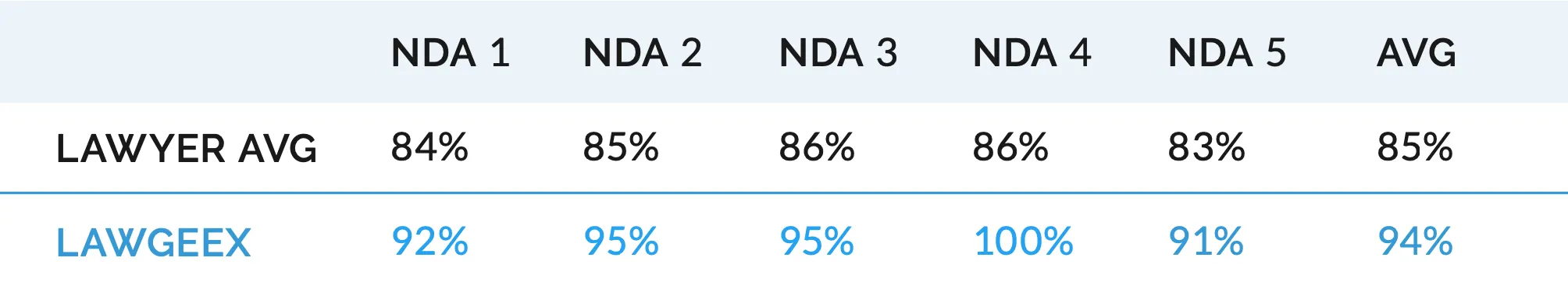 이스라엘의 계약 검토 시스템 기업 Lawgeex에서는, 법률 계약서 내 문제를 탐지하도록 자체 개발한 AI 알고리즘이 계약서 검토의 정확성을 높였다는 자료[5]를 발표했어요. NDA 검토 경험이 풍부한 변호사 20명과 LawGeex AI 알고리즘이 5개의 NDA(Non-Disclosure Agreement, 비밀유지협약)에서 법적으로 문제가 될 수 있는 부분을 찾아내도록 하는 실험을 진행했습니다.