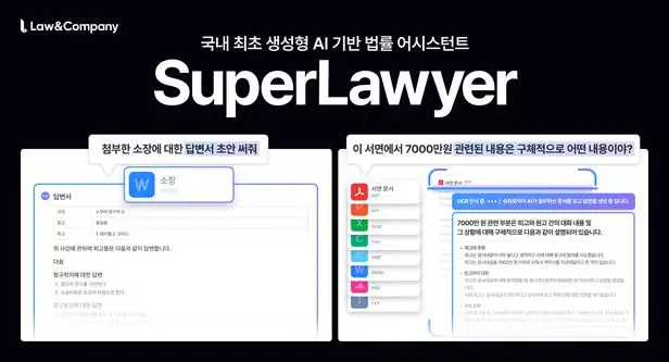로앤컴퍼니에서도 법률 시장의 혁신과 확대를 위해 지난 7월 생성형 AI 서비스 슈퍼로이어(SuperLawyer)를 출시했습니다. 슈퍼로이어는 생성형 AI와 법률 데이터를 활용해 변호사 업무를 효과적으로 지원하는 대화형 법률 AI 어시스턴트입니다.