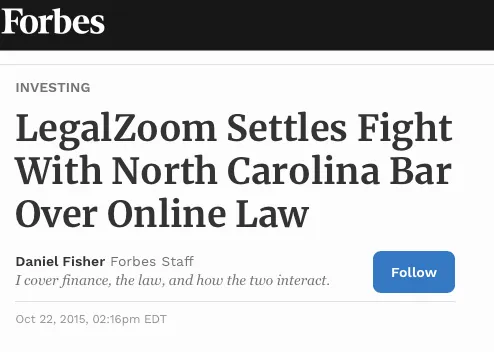 2001년 창립된 미국의 대표적인 변호사 마켓플레이스이자 법률문서 자동 완성 사업자인 ‘Legalzoom(리걸줌)’은 2008년부터 8년 간 노스캐롤라이나주 변호사협회와 갈등했습니다. 다른 주의 변호사협회들도 Legalzoom(리걸줌)을 법적으로 공격했으나 결국 소 진행을 포기했었는데요, 노스캐롤라이나주 변호사협회만 유독 끈질기게 갈등을 유지했습니다.