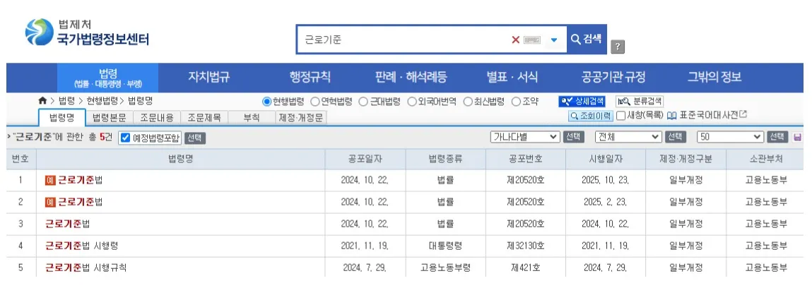 위 이미지와 같이 국가법령정보센터 검색창에 국가법령 ‘근로기준’이라는 키워드를 입력했더니, 핵심어와 매칭된 “근로기준법”, “근로기준법 시행령” 등이 검색되었습니다.