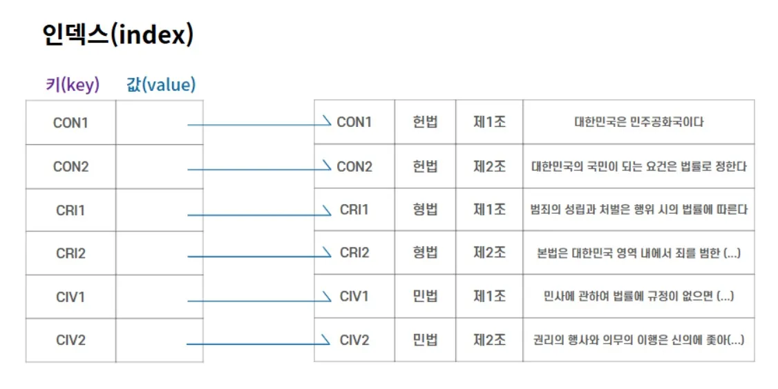 예를 들어 데이터에서 헌법 제1조를 찾는다고 했을때, 우선 인덱스에서 헌법이라는 카테고리를 찾아야 합니다. 이미지에 ‘CON1’ 라고 적힌 키가 있네요. 키를 찾았으니 구체적인 데이터가 있는 행을 찾아야겠죠? CON1과 같은 행의 값을 찾고, 값의 포인터, 즉 화살표를 따라 가봅시다. “대한민국은 민주공화국이다”라는 구절을 확인할 수 있습니다! 만약 인덱스가 없다면 데이터베이스는 헌법 제1조를 찾기위해 테이블을 처음부터 끝까지 스캔해야 헌법 제1조를 확인할 수 있기 때문에 검색하는 시간이 매우 길어집니다. 이렇듯 인덱스를 있을 때는 대량의 데이터에서도 검색 기능이 획기적으로 향상됩니다.