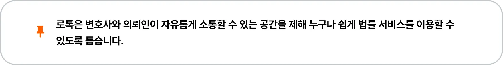 로톡은 누구나 필요할 때 법률 전문가의 도움을 받을 수 있도록, 변호사님의 업무 효율성과 생산성 극대화를 위해 노력하겠습니다.