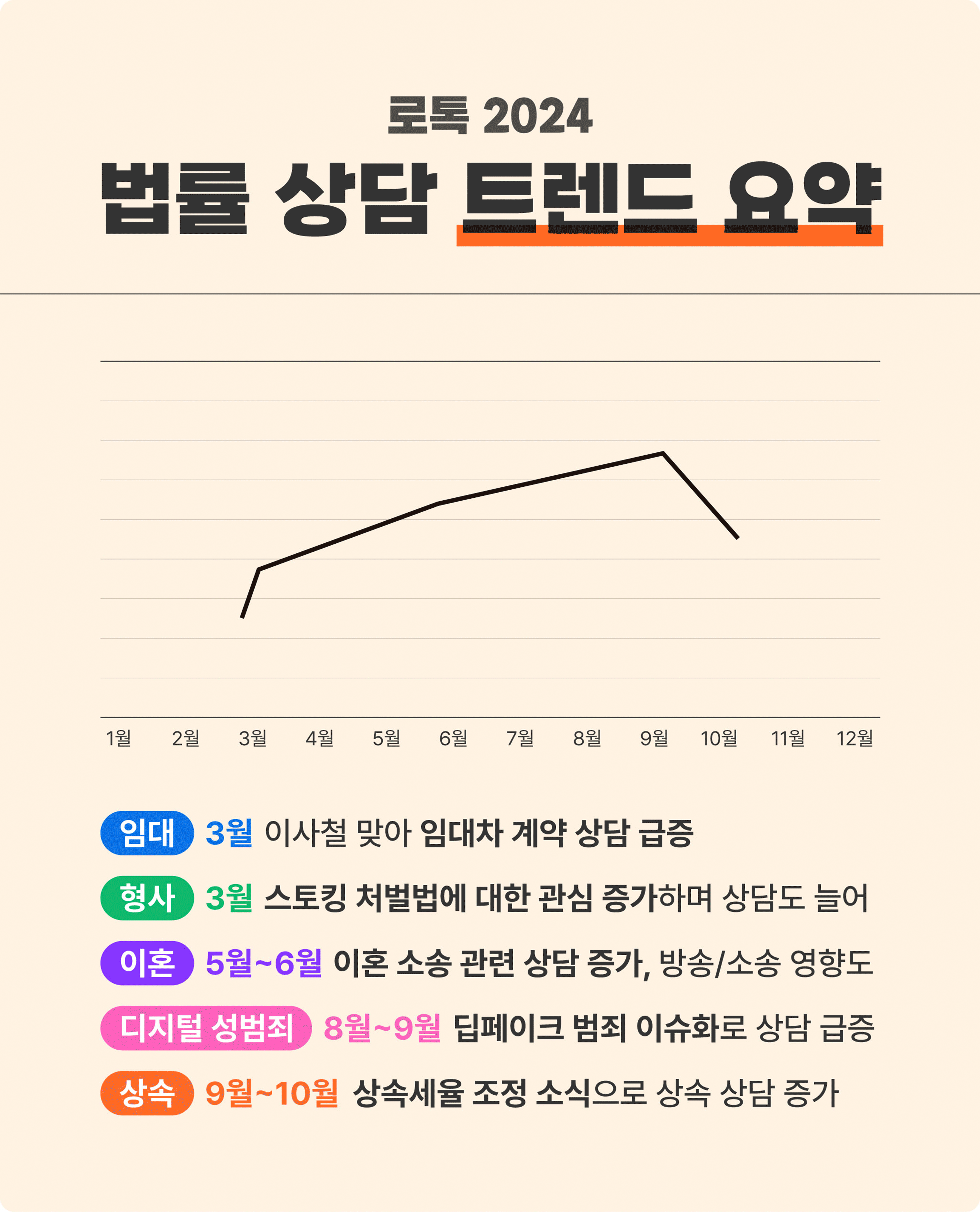 로톡의 2024년 법률 상담 트렌드를 한 눈에 볼 수 있도록 이미지로 정리해보았는데요, 이렇게 보니 지난 1년 간의 법률 상담 트렌드 추이가 쉽게 확인되네요!