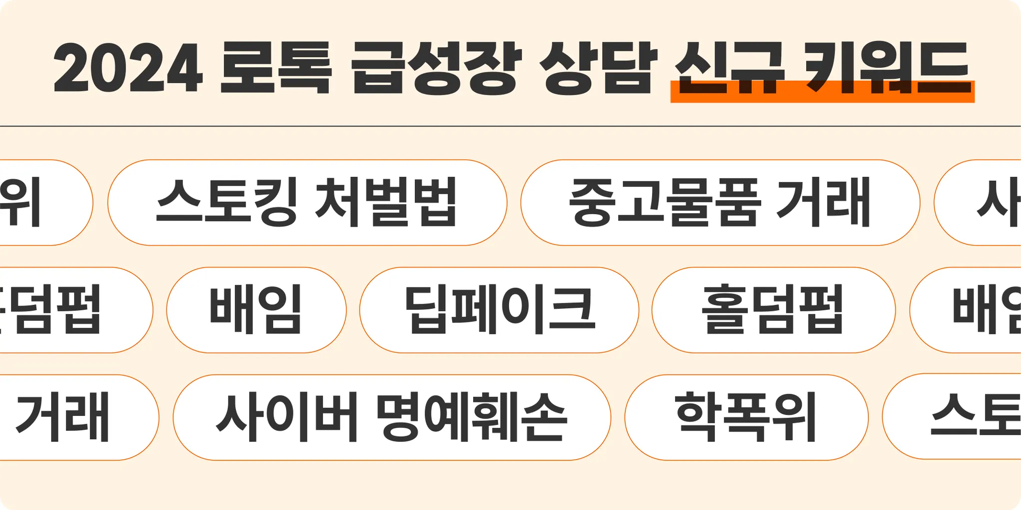 앞서 언급한 딥페이크, 스토킹처벌법 외에 다양한 키워드들이 2024년 급성장 했는데요, 특히 스토킹처벌법과 홀덤펍은 2024년 이후 로톡에 새롭게 등장한 키워드입니다.
