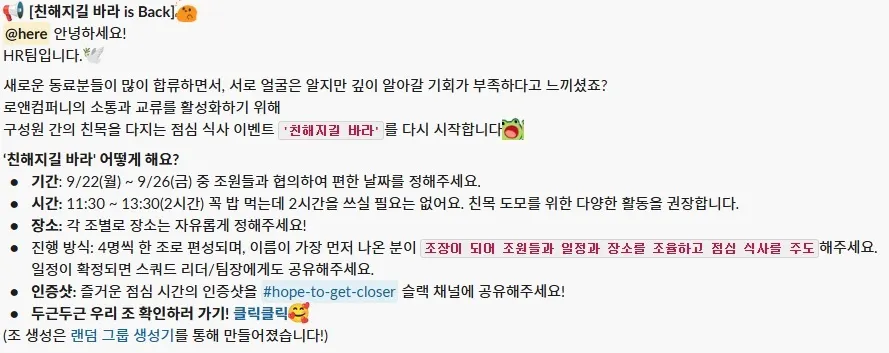 첫째. 안내에 따라 각 조원을 확인한 뒤, 별도 소통 채널을 만들어 점심 식사 일정을 맞춥니다. 조원은 더 많은 사람들이 서로 친해지길 바라는 마음을 담아, 가급적 본부나 팀원이 함께 조를 이루지 않도록 랜덤하게 구성하는데요, 실제로 이번 친해지길 바라는 팀, 연차 등이 서로 다른 분들로 조합된 경우가 많아 프로그램 취지를 굉장히 잘 살렸다는 평가를 받았습니다!