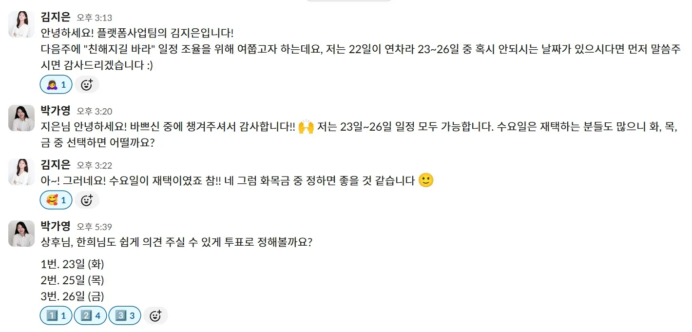 또 채널을 통해 속속 올라오는 후기 덕분에 서로의 MBTI부터 취미, 좋아하는 운동, 어린 시절 재미있는 에피소드까지! 일로 만났을 때는 미처 알지 못했던 다양한 이야기를 접하면서 더 많은 분들과 자연스러운 스몰토크 기회가 생겼습니다.