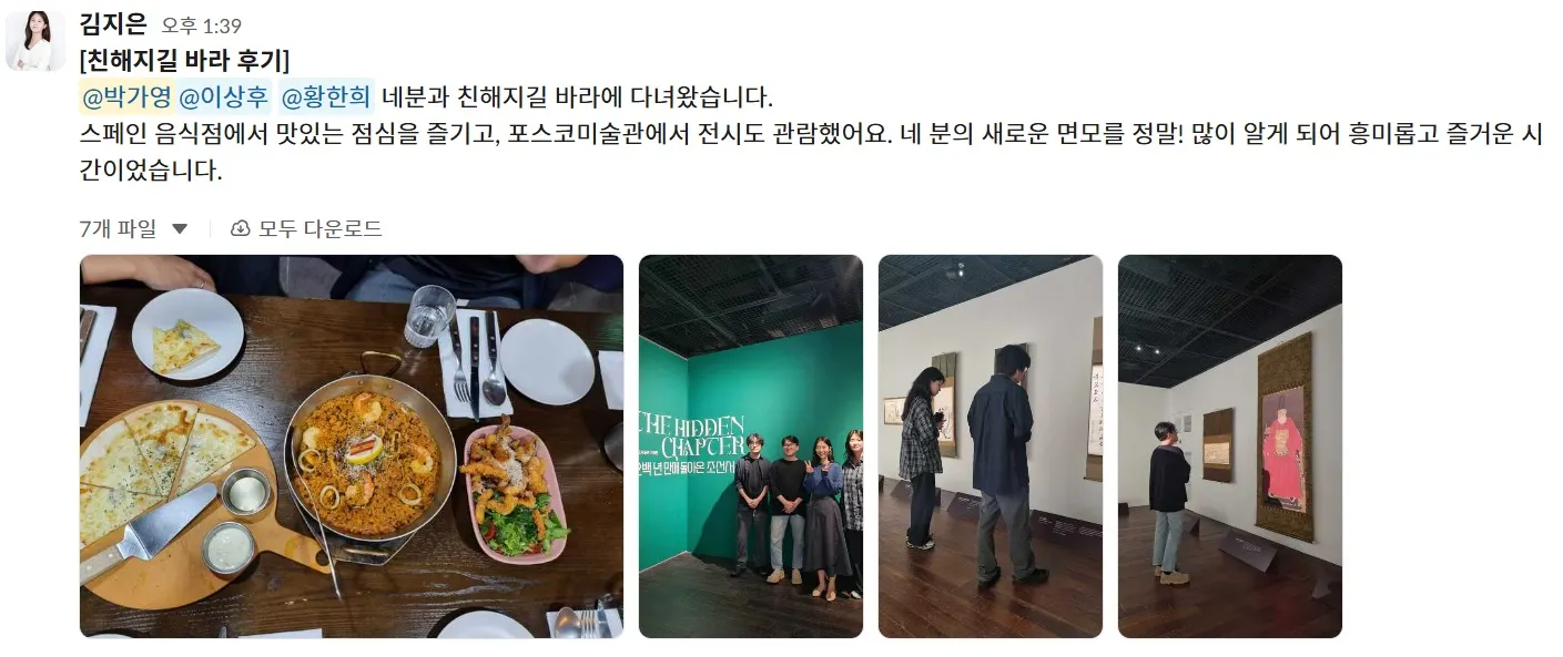 셋째. 즐거운 시간을 인증샷으로 남겨 소통 채널에서 구성원들과 공유합니다.