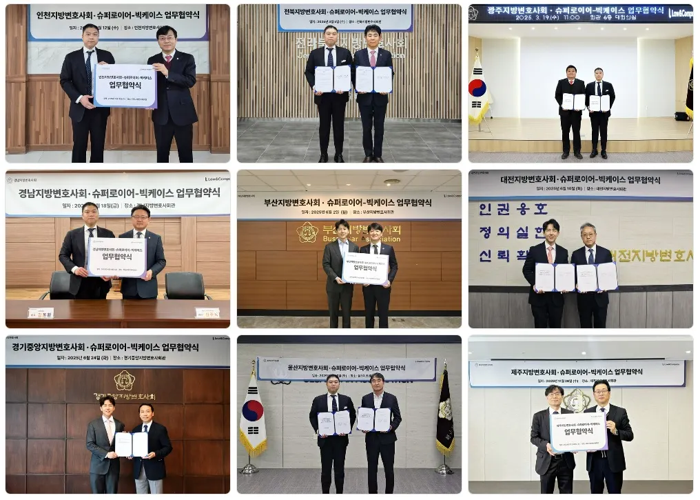 인천을 시작으로 전북·광주·경남·부산·대전·경기중앙·울산·제주에 이르기까지, 정말 많은 지방변호사회와 손을 잡고 법조계 AI 혁신을 위한 발걸음을 내디뎠는데요, 로앤컴퍼니는 협약을 맺는 지방변호사회 소속 회원들을 대상으로 슈퍼로이어와 빅케이스 등의 구독 상품을 특별가로 이용할 수 있는 혜택을 제공하기로 했습니다. 이와 함께 다양한 교육 프로그램을 통해 AI 리터러시 향상을 위한 노력도 계속하기로 약속했습니다.