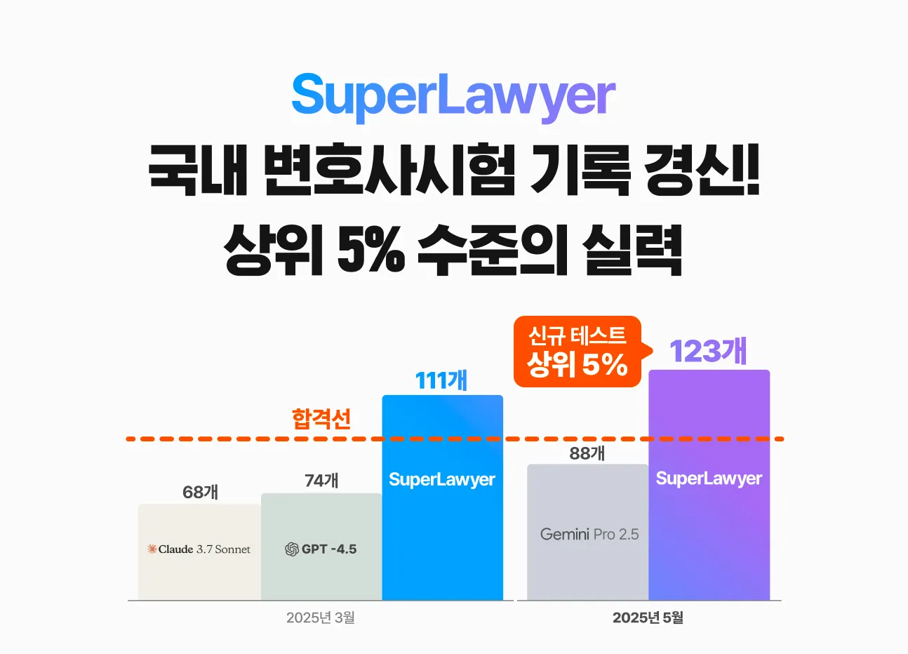 슈퍼로이어의 도전은 여기서 그치지 않았습니다. 꾸준한 성능 고도화를 통해 같은 해 5월 123개 정답을 기록하며 또 한 번 업계를 놀라게 했는데요, 정답수 123개는 변호사시험 전문기관 예측 기준 합격자 상위 5%에 해당하는 수준이라는 점! 정말 놀랍지 않나요?