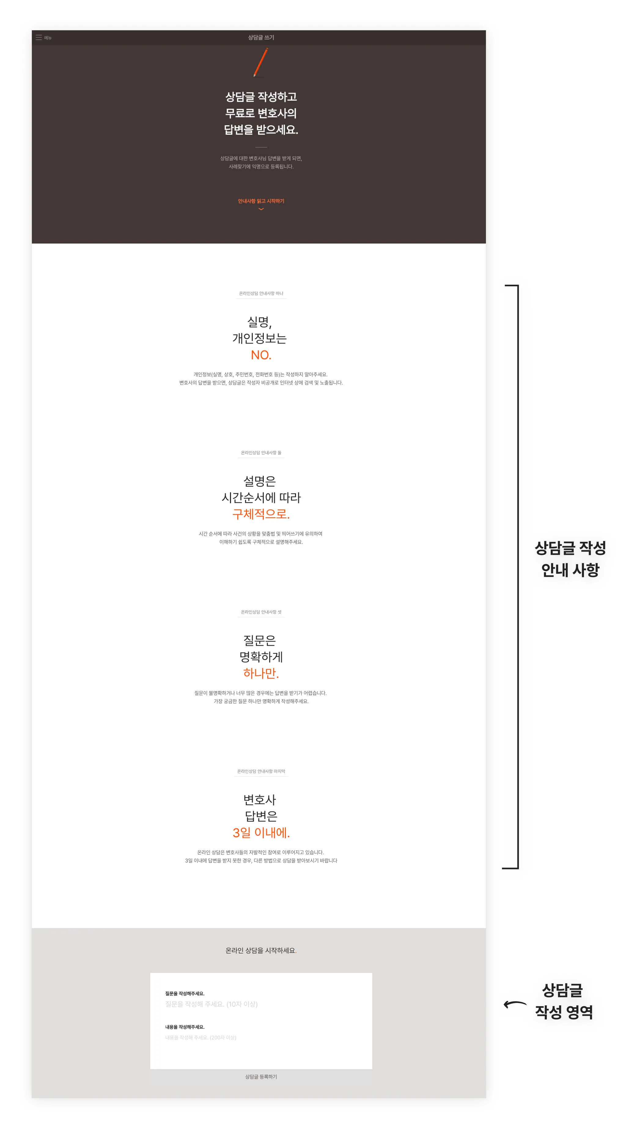 그래서 디자인팀에서는 양질의 상담글 콘텐츠가 만들어질 수 있는 기반을 마련하고, 의뢰인들이 작성가이드를 정확하게 인지하면서도 쉽게 상담글을 작성할 수 있도록 온라인 상담글쓰기 작성 프로세스 및 화면을 개선했습니다.
