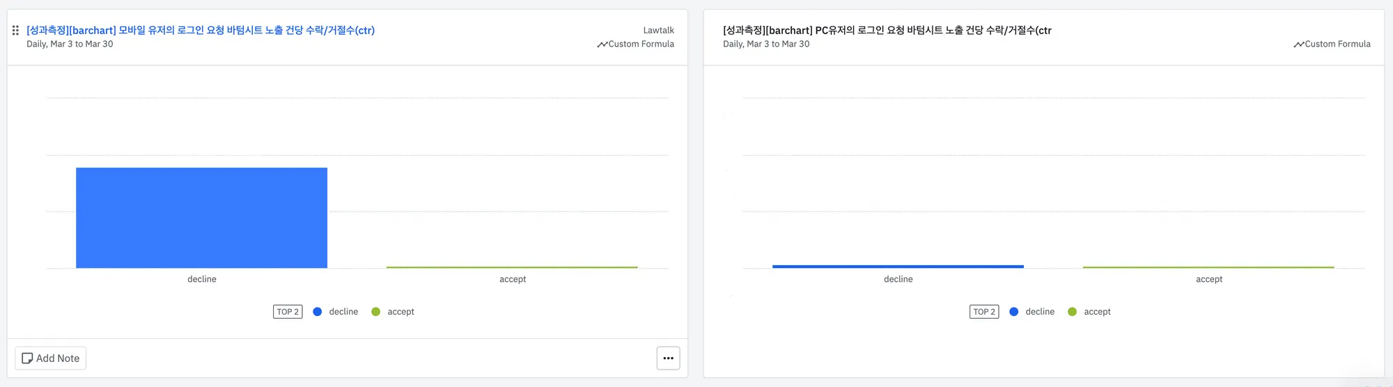 또한, 단순 목적 지표 추이를 통해 목적을 달성했는지 보는 것에만 그치지 않고 모바일과 데스크탑 유저로 나눠서 로그인 요청 바텀시트에 대한 유저들의 반응까지 살펴보았어요.