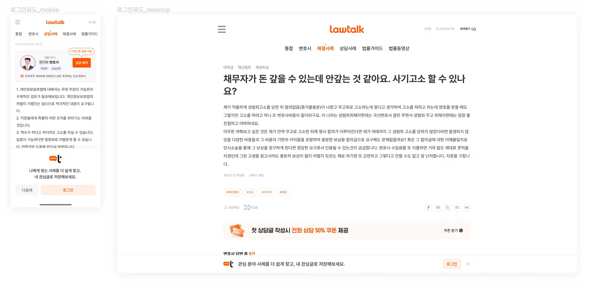 사실 단순 로그인 유도를 하여 로그인 비율을 높이면 재방문율이 올라갈 것이라는 논리에는 문제가 있습니다. 원래 재방문 의사가 있어 회원가입을 하거나 로그인을 한 유저일 수 있기 때문입니다. 로톡 서비스는 온라인 글 작성이나 유료 상담 예약 기능을 제외하면 모든 콘텐츠는 로그인 없이 탐색할 수 있기 때문에 ‘로그인’을 했다는 점으로 재방문을 유도하기는 어려울 수 있지만, 일단 작은 기능을 출시해 넛지를 가해보고 유저 반응을 살피며 경험 데이터를 쌓아보자는 생각으로 로그인 요청 기능을 기획하게 됐습니다.